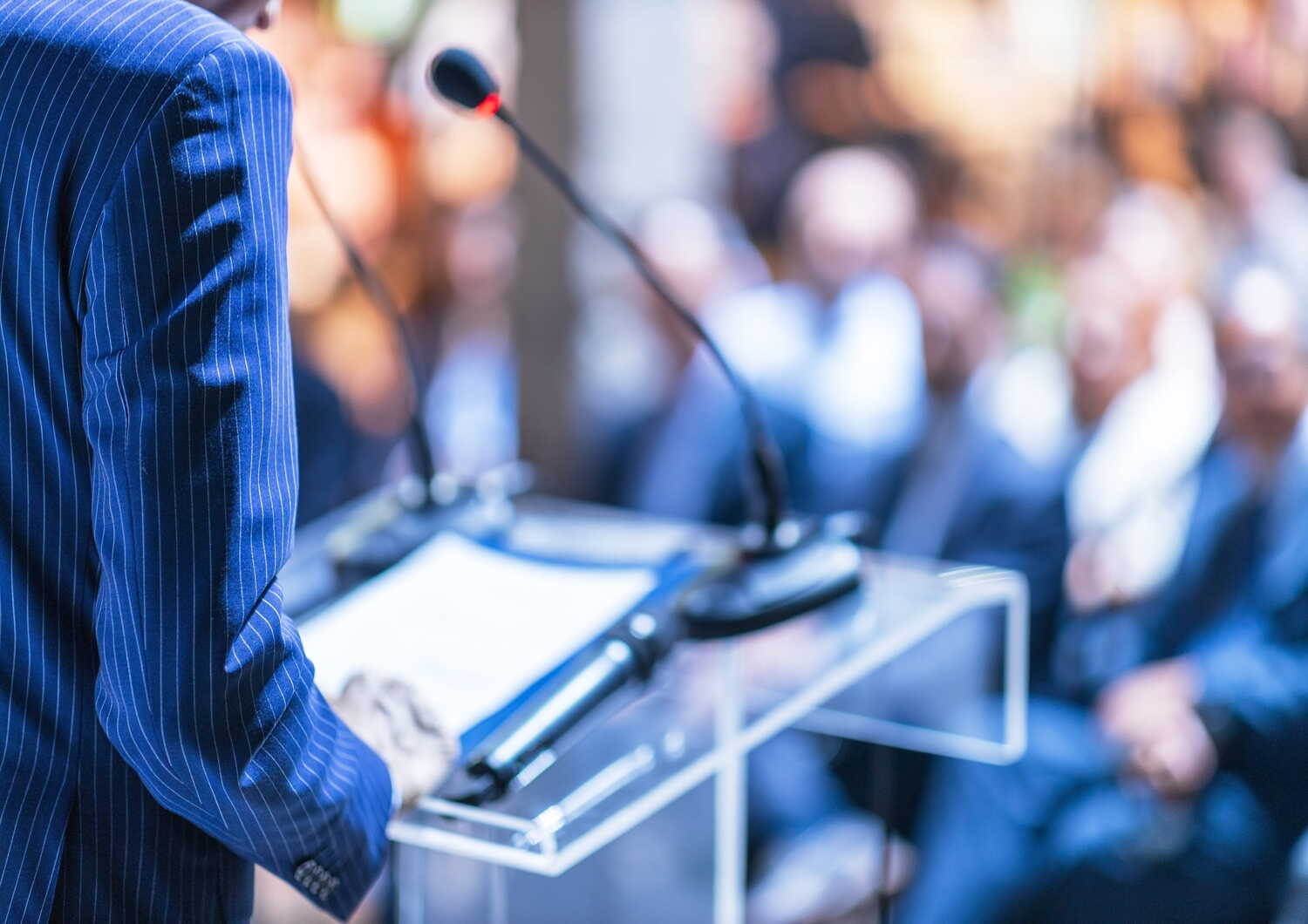 Close up of a speaker talking at a conference supported by CTI Meeting Technology.